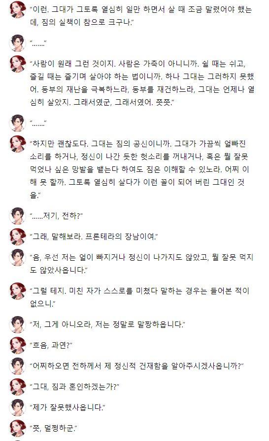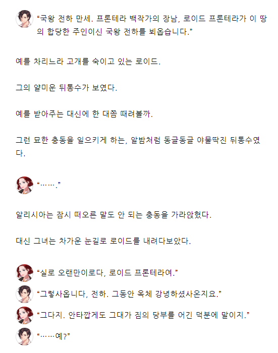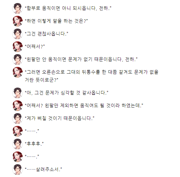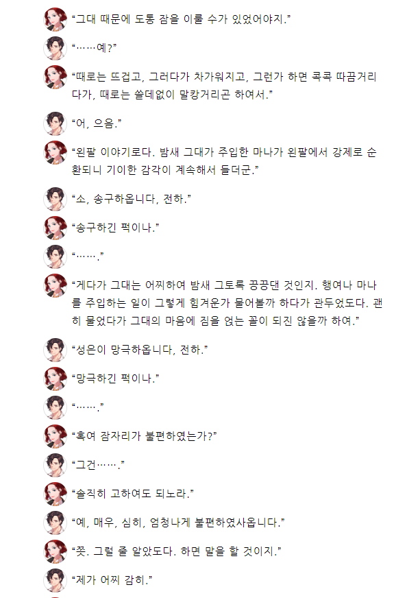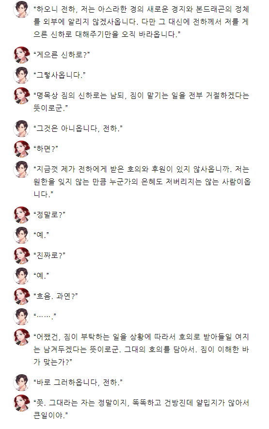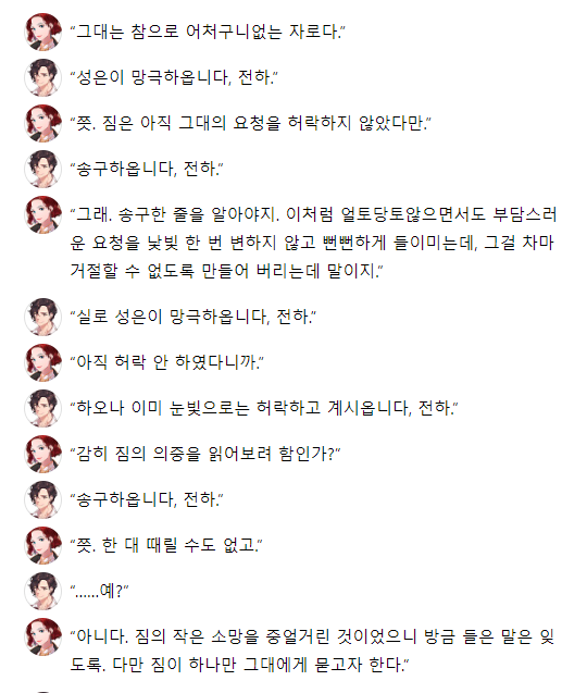 "짐은 알고 있어. 아까는 그대가 짐의 목숨을 살렸도다. 하여 짐이 친히 그대에게 상을 내리고자 한다."